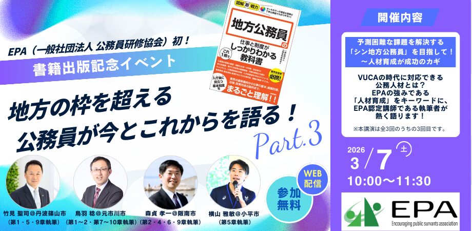 EPAは、公務員の「専門性」「独自性」を深く理解している現職公務員(元公務員)が、それぞれの経験、専門領域を活かして本当に必要な「公務員のための学び」をご提供し、公務員を応援します。